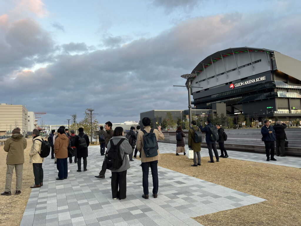 2025年12月22日(月)に2021年にポートミュージアムがオープン、GLION ARENA KOBEが2025年4月にオープンするなど、新しい時代にふさわしい形で再生が進んでいる神戸ウォーターフロントエリア(神戸市中央区)にて、取組に携わっておられる、神戸市港湾局、株式会社One Brigth KOBE、株式会社神戸ウォーターフロント開発機構の方を迎え、プロジェクト紹介と現地視察を行うフィールドワークを開催しました。